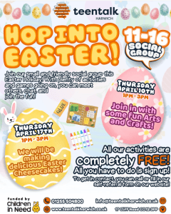 Join our small and friendly social group this Easter Holiday! With plenty of activities and games going on, you can meet others, chat and join in the fun! On Thursday 17th April we will be hosting a Easter baking event, where we will be making Easter cheesecakes. This is for ages 11 – 16 and is a free event.